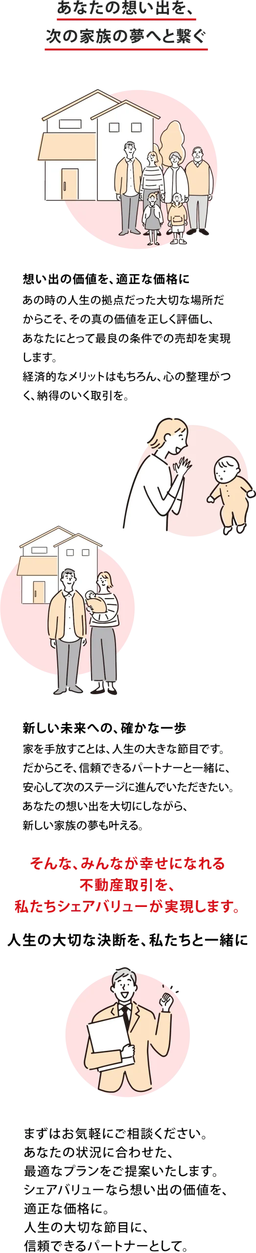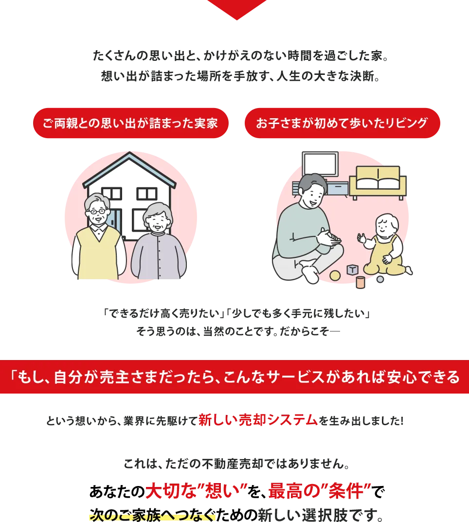 建築会社として培ってきた効率化・最適化のノウハ ウを活かし、余計なコストやリスクを減らし、その ぶん、売主さまと買主さま、どちらにもしっかりと還元しています。
