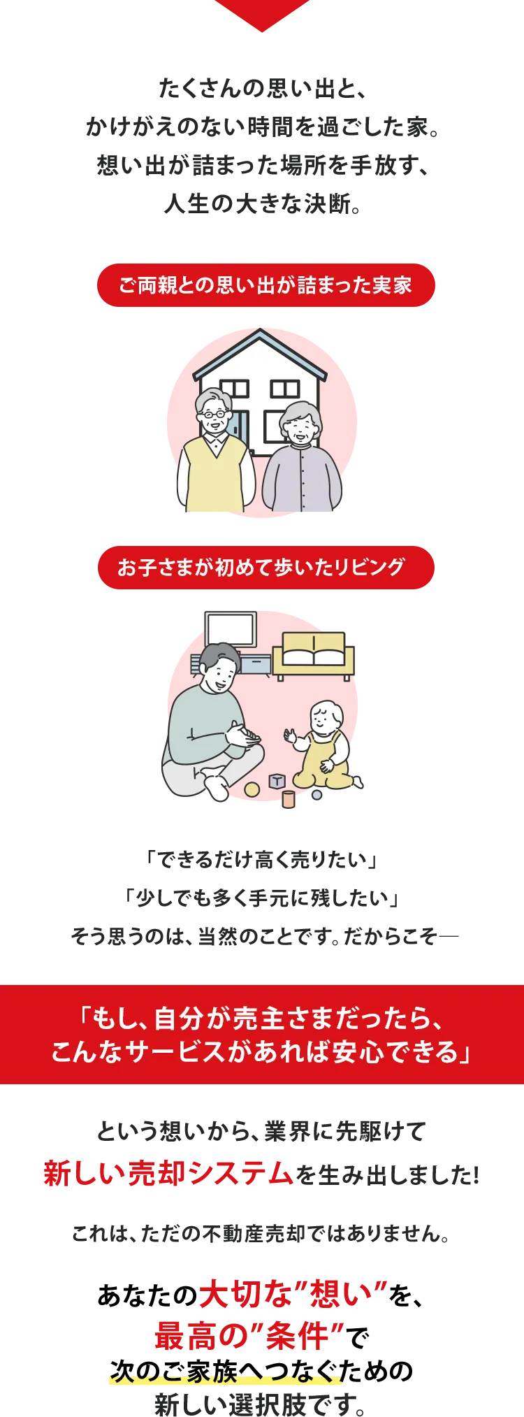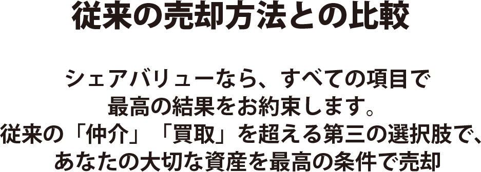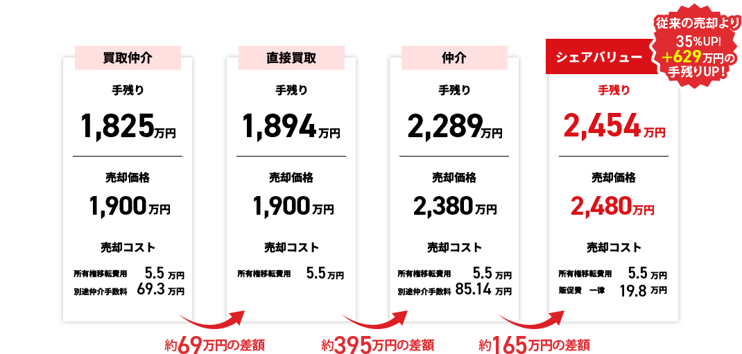 私たちは物件を買い取らないので、価格を安く抑え る必要もありません。そのため、買取価格より高く、 一般的な仲介相場も上回る価格で販売できます。